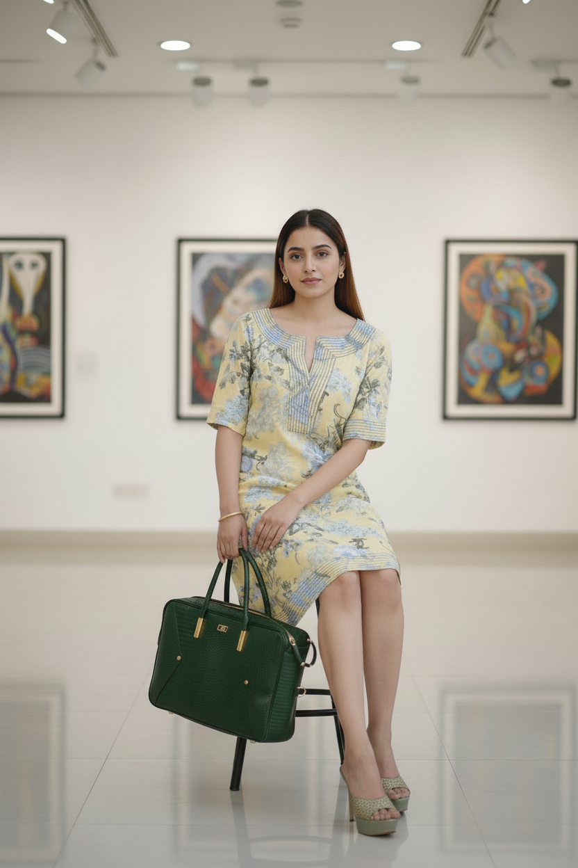 This pure linen formal dress brings effortless sophistication to your workday wardrobe. The soft yellow base is adorned with subtle blue floral motifs, creating a fresh yet understated aesthetic perfect for business settings.